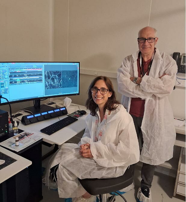 Foto: Microscopia confocal en el IRD, Lorena Siena (izquierda) y Juan Pablo Ortiz (derecha)